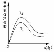 (3)一定条件下NH3的平衡体积分数随n(N2)变化如下图所示 (T-温度)。则T2___T1 (填>、=、<)。