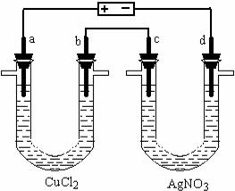 29.(18分)如下图是一套电解装置,两U型管中均盛有50.0 mL电解质溶液,a、b、c、d为 Pt电极。通电一段时间,d电极上析出金属Ag 2.16 g,没有气体产生。同时在b、c两极收集到标准状况下相同体积的气体。请回答: