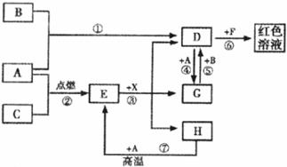 17.(12分)A、B、C为中学常见单质,其中一种为金属;通常情况下A为固体、B为液体、C为气体。D、E、F、G、H、X均为化合物,其中X是一种无氧强酸、E为黑色固体,H在常温下为液体。它们之间的转化关系如下图所示(其中某些反应条件和部分反应产物已略去)。