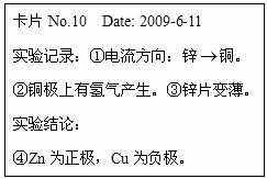 13.下图是Zn和Cu组成的原电池,某兴趣小组做完实验后,在读书卡片上记录如下:卡片上描述合理的是
