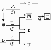 20、(13分)已知A、B、C、D为常见单质,其中B、C、D常温常压下为气体,甲、乙、丙、丁为常见的化合物,乙常温下为液体,丙的焰色反应为黄色,下图为各种物质之间的转化关系。