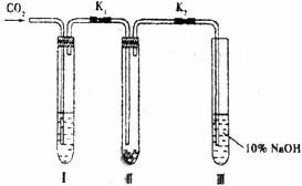 实验甲:干燥的二氧化碳和过氧化钠的反应。在干燥的试管Ⅱ中装入Na2O2,在通入CO2之前,关闭Kl和K2。在试管Ⅰ内装入试剂X后,打开Kl和K2,通入CO2,几分钟后,将带火星的木条插入试管Ⅲ的液面上,观察到木条不复燃,且Ⅱ中的淡黄色没有变化。