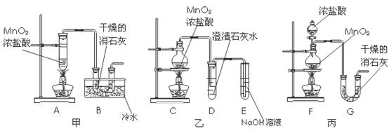 16、(16分)某校化学研究性学习小组要利用已经学过的化学知识制取少量漂白粉,并进一步探究漂白粉的化学性质。他们查阅资料得知:2Cl2+2Ca(OH)2=Ca(CO2)+CaCl2+2H2O是放热反应,温度稍高时便发生副反应:6Cl2+6Ca(OH)2→Ca(ClO3)2+5CaCl2+6H2O。学生设计出了甲、乙、丙三套装置: