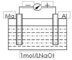 如图,剪取约8cm的镁条及大小相近的铝片,用砂纸去膜,使镁条与铝片分别与量程为500μA的教学演示电表的“-”、“+”端相连接,迅速将两电极插入盛有1mol/LNaOH溶液的烧杯中。开始,电表指针向右偏移约500μA,铝片表面有许多气泡,很快电流逐渐减小至0;随后,指针向左偏移,且电流逐渐增大至约400μA,此时,铝片表面气泡有所减少,但镁条表面只有极少量的气泡产生。根据以上实验现象,回答下列问题: