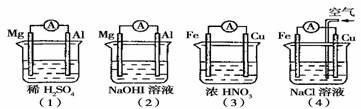A.(1)(2)中Mg作负极,(3)(4)中Fe作负极