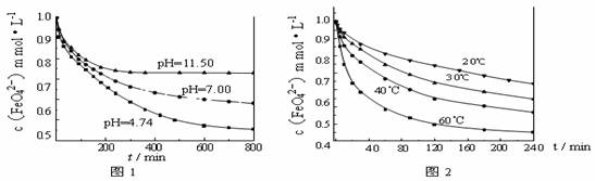 [实验2]:将适量 K2FeO4 溶解于pH=4.74 的水溶液中,配制成FeO42-浓度为 1.0mmol·L-1 的试样,将试样分别置于 20℃、30℃、40℃和 60℃的恒温水浴中,考察不同温度对K2FeO4某种性质的影响,结果见图2。