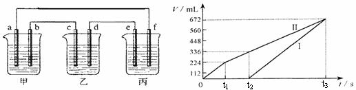 28.下图所示装置中,甲、乙、丙三个烧杯依次分别盛放100g 10.00%的K2SO4溶液、足量的CuSO4溶液、100mL AlCl3和Cu(NO3)2的混合溶液,乙中其中一个电极为锌电极,其余均为石墨电极。一段时间后,e电极质量增加。理论上丙中两极所得气体的体积随时间变化的关系如下图所示(气体体积已换算成标准状况下的体积)。据此回答下列问题: