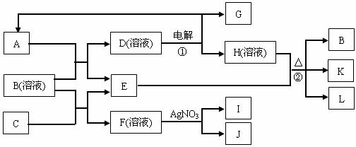 下图表示有关物质之间的转化关系,A、C、E、G为非金属单质,其中A、G常温常压下为气态,E遇淀粉变蓝,K是一种常用食品添加剂,L是常见的无色无味液体,I为淡黄色固体,J的焰色反应呈浅紫色(透过蓝色钴玻璃)。