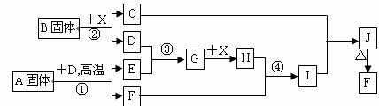 24.(10)根据下列框图关系填空,已知反应①、③是我国工业生产中的重要反应,X常温下为无色无味透明液体;C焰色反应火焰呈黄色,J为红褐色沉淀;D、E常温下为气体,且E能使品红溶液褪色;A固体中仅含铁、硫两种元素,,其中金属元素的质量分数约为46.7%。