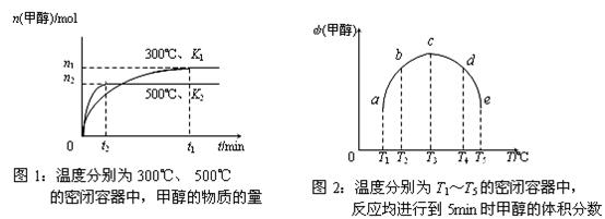 CH3OH(g)。在容积均为1L的a、b、c、d、e五个密闭容器中分别充入等量的1mol CO和2mol H2混合气体,控温。实验测得相关数据如下图1和图2。