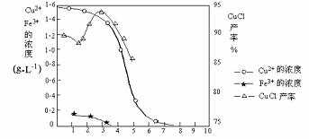 用滤液中Cu2+、Fe3+的含量对pH作图,可直观地反映出滤液中金属离子含量与pH之间的关系以及反应①系统pH与CuCl产率的关系。
