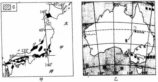 (1)、说出图中甲、乙两城市在地理位置上的共同点。(2分)