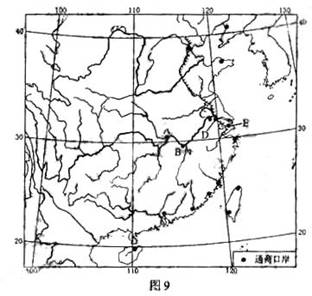 图9表示两次鸦片战争后清政府开放的通商口岸的分布。