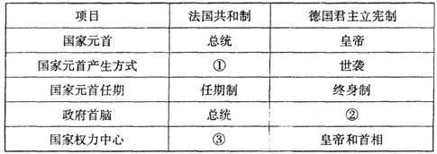 21.下面是近代法德两国政体的比较,表中数字处填的内容应分别是( )