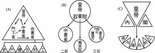 8.A、B、C图中哪一幅反映的是唐朝对中央官制的改革创新? ( )