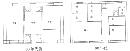 材料三 从下列两图可见,下岬村的居住格局也出现了变化:住宅空间日益私密,房间的称呼日趋现代,并且增添了新的设施。
