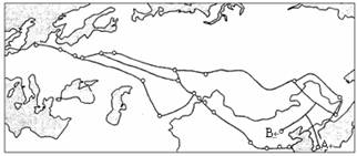 (1)图中字母所代表的城市是:A B ;第一条亚欧大陆桥是西伯利亚大铁路,东起 西至 ;第二条亚欧大陆桥是从中国的 到荷兰的第一大港 。(12分)