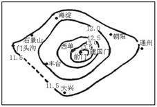 下图是“北京城、郊年平均气温分布图”(单位:℃),读图回答19-21题。