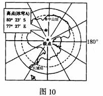 46.(12分)图10中高点冰穹A是南极内陆冰盖海拔最高的地区,气候条件极端恶劣,被称为“不可接近之极”。我国科学考队于北京时间2005年1月9日22时15分成功登上了冰穹A点。这是人类首次征服“不可接近之极”。