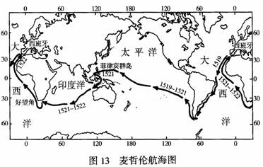 49.(12分)1519年9月20日,麦哲伦的船队从西班牙的圣罗卡出发,踏上了环球航行的征途。1522年9月6日,麦哲伦船队的“维多利亚”号历经磨难返抵西班牙,花了整整3年的时间,终于完成了人类历史上首次环球航行。读图13及材料,回答下列问题。