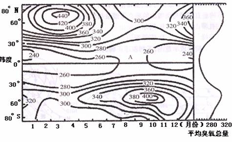 读大气臭氧的季节变化和纬度分布示意图,回答10-12题。