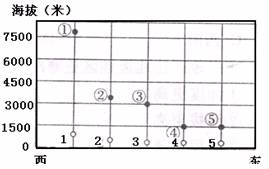 下图是30°N附近五座名山的海拔比较图,图中①②③④分别代表贡嘎山、二郎山、峨眉山、庐山和黄山,空心圆圈表示各山的山麓位置,读图回答13-16题。