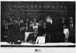 图三是中国代表团团长石广生在中国入世议定书上签字图。