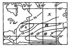 下图为某大洋部分海区年平均逐日从海洋输入大气的总热量分布图(单位:W/m2),读图回答24-27题。