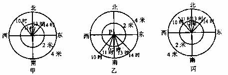下图是6月22日三个地点用2米长的杆在当时时间10:00~14:00测得的杆影长度,图中2米和4米是指圈的半径。回答28-30题。