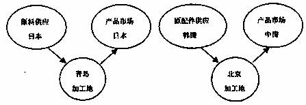 我国东部沿海地区两家境外投资工厂的原料地、加工地和产品市场示意图。读图回答9-10题。