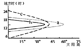 62.(10分)下图是冬至日时地球上某三地(a、b、c)太阳高度日变化曲线图。读图回答: