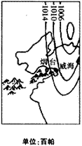 64.(8分)2005年入冬以来,黄海、渤海水温较往年偏高,烟台、威海连续出现强降雪天气,成为当地有气象记录以来最大的降雪过程。下图中为该时间段的气压形势图,降雪期间,该天气系统持续时间长且较稳定。