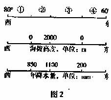 图2为45°S附近某地区的相关数据,其中①④处为海洋,②③处为陆地,80°、60°为当经度。读图回答第4-7题。