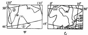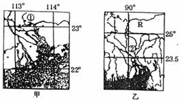 (1)图甲和图乙相比,比例尺较大的是 ,图中城市①位于城市②的(方向) 。