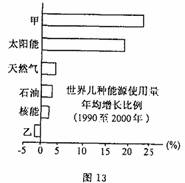 读“世界几种能源使用量年均增长比例图”,其中甲能源为可再生能源,乙能源为非可再生能源。完成25-26题。