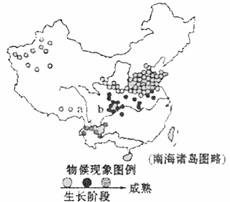 读“多年平均情况下,三月上旬我国某种农作物物候现象分布示意图”,回答5-6题。