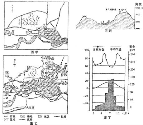 26.(25分)下列四幅图中,图甲、乙分别为某城市1972年、2006年城区图;图丙、丁分别为该城市所处地形位置和气候图,读图回答下列问题。