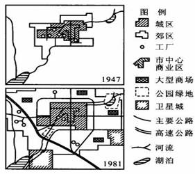 22.读下图“某大城市1947年和1981年的同比例尺平面示意图”,比较两图回答: