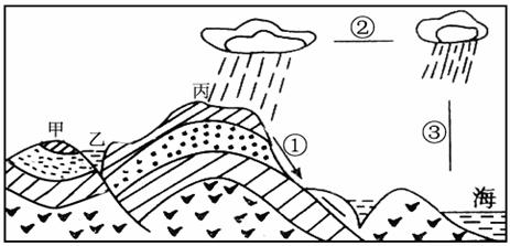 ⑵ 甲、乙、丙三处的地质构造分别为:(3分)