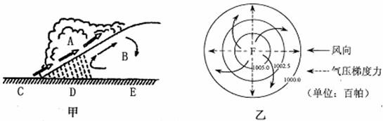 (2)甲图为____锋天气图。该锋面过境后,E地天气状况是: 。