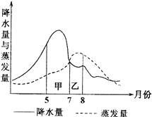 读某地降水量(实线)与蒸发量(虚线)的季节变化曲线示意图(下图),据图完成34-36题。