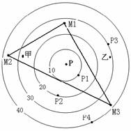下图中,M1、M2、M3分别为原料地、燃料地和市场。图中P点是某企业生产产品的运费最低点和劳动力费用最高点。以P为圆心的同心圆是该企业的等运费线(单位:元)。据此回答13-15题。