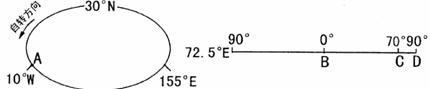 35、下图为“30°N纬线圈和72.5°E经线”,其中30°N纬线上由10°W向西到155°E为夜半球,同时72.5°E经线上只有CD段处于夜半球。读图回答下列问题。(14分)