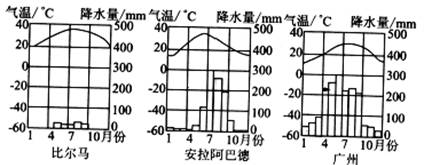 33.(10分)非洲的比尔马(19°N,13°E)、印度的安拉阿巴德(25°N,81°E)和我国的广州(23°N,113°E)都位于北回归线附近,下图为三地年内各月气温及降水量图。