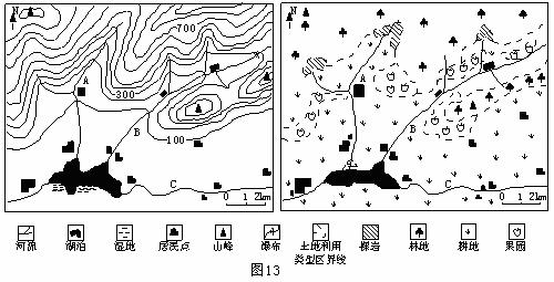 读图13,下左图是我国南方某流域局部地形图,下右图是该地区土地利用现状图。回答21-22题。