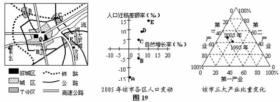 30.以下是某城市略图19(该城市有四个工业区,分别是钢铁、机械、轻纺和高新技术产业开发区)及该市2005年各地区人口变动(人口迁移差额率指人口迁入率与人口迁出率之差)、1995-2005年三大产业比重变化示意图。读图回答以下问题:(10分)