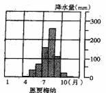 下图为世界某城市恩贾梅纳(约12.50N,150E)月降水量图,该地最低月均温在20℃以上。据此回答1-2题。