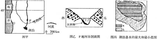 图甲为某区域示意图,图乙反映图甲中的P地河谷剖面,P地河谷剖面的形成与地转偏向力的作用有关,图丙反映图甲对应的湖泊情况。回答8-10题。
