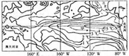 读厄尔尼诺发生时太平洋表层水温异常现象示意图,回答21-23题