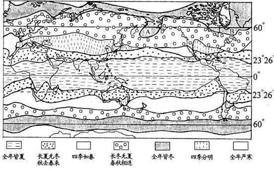 (2)A、B两地与同纬度其它地区相比,四季类型有何不同?简析其主要原因。(8分)